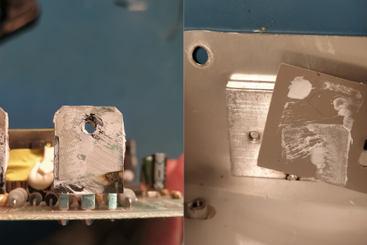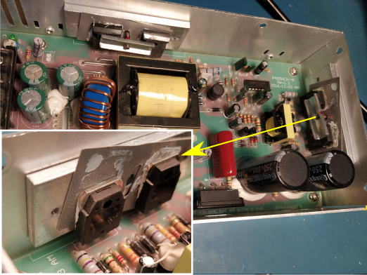 Následuje tedy rozborka zdroje zjišťuji, že došlo k průrazu z tranzistoru na chladič. Výstupní kontrola asi něco přehlédla a pustila špatně uloženou izolační podložku. Proto tedy to záhadné vyhození jističe v týdnu.